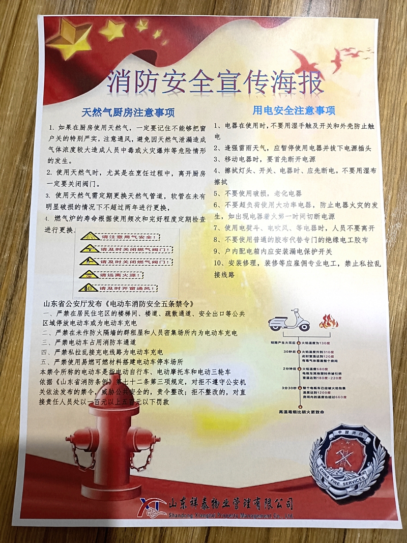 6月17日,為貫徹落實(shí)好集團(tuán)公司安全生產(chǎn)月工作要求,人和藍(lán)灣小區(qū)開展消防安全主題活動。人和商管公司、安全品控部和山東祥泰物業(yè)公司相關(guān)負(fù)責(zé)人參加。 活動當(dāng)天,物業(yè)消防負(fù)責(zé)人員向詳細(xì)講解了滅火器、消防栓及消防水帶等器材的使用方法,組織開展了火情處置消防演練,并在小區(qū)發(fā)放安全宣傳單,切實(shí)讓全體物業(yè)
