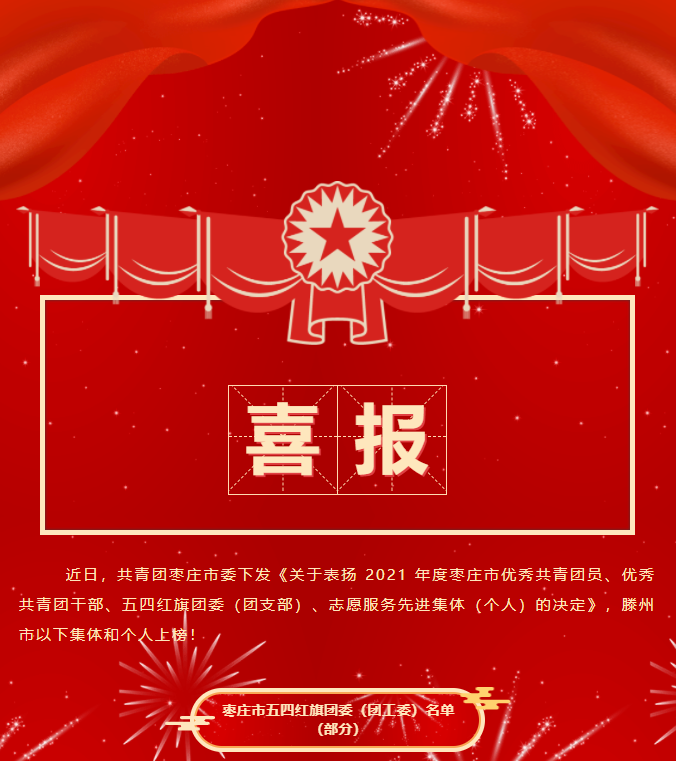喜報(bào) 近日,共青團(tuán)棗莊市委下發(fā)《關(guān)于表?yè)P(yáng) 2021 年度棗莊市優(yōu)秀共青團(tuán)員、優(yōu)秀共青團(tuán)干部、五四紅旗團(tuán)委(團(tuán)支部)、志愿服務(wù)先進(jìn)集體(個(gè)人)的決定》,滕州市以下集體和個(gè)人上榜!棗莊市五四紅旗團(tuán)委(團(tuán)工委)名單(部分)棗莊市五四紅旗團(tuán)支部(團(tuán)總支)名單(部分)棗莊市優(yōu)秀共青團(tuán)員名單(
